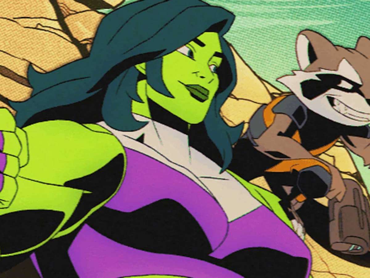 Mulher-Hulk esmaga o fronte e Rocket Raccoon descarrega um arsenal futurista de armas