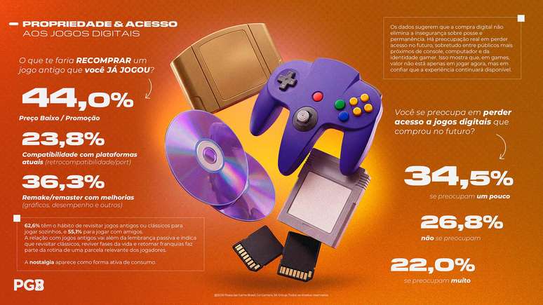 Outro ponto levantado pela PGB é sobre o poder das propriedades intelectuais para este consumidor: com cada vez mais jogos disponíveis em nuvem ou apenas em edições digitais em detrimento das cópias físicas, 34,5% dos respondentes disseram que se preocupam um pouco com a possibilidade de perderem o acesso, no futuro, aos jogos digitais que compraram nos últimos anos. 26,8% dizem “não se preocupar nem um pouco” com essa questão, e 22% afirmam que “se preocupam muito” com a possibilidade de não ter mais acesso aos seus games por falta de uma edição física.