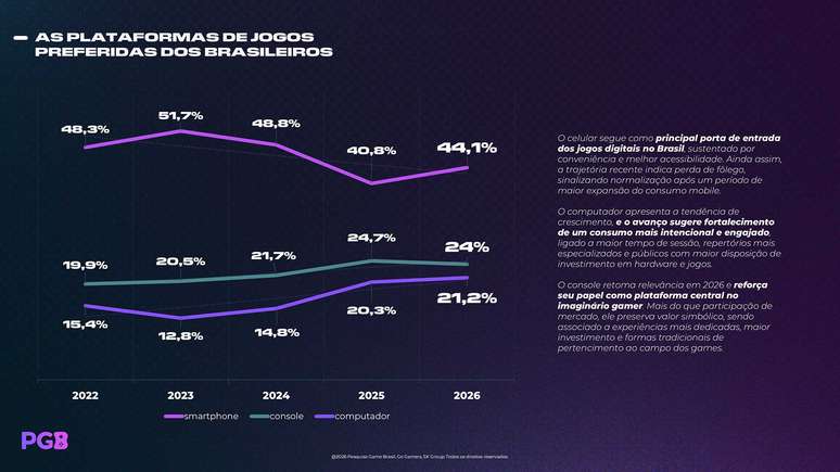 Além disso, a pesquisa diz que está ocorrendo um movimento espontâneo de maior adesão ao PC e aos consoles. Apesar de o celular seguir como principal porta de entrada dos jogos digitais no Brasil, considerando a conveniência e melhor acessibilidade (com 44,1% da preferência), os usuários de PC atingiram 21,2% das respostas, enquanto os consoles chegam a 24%.