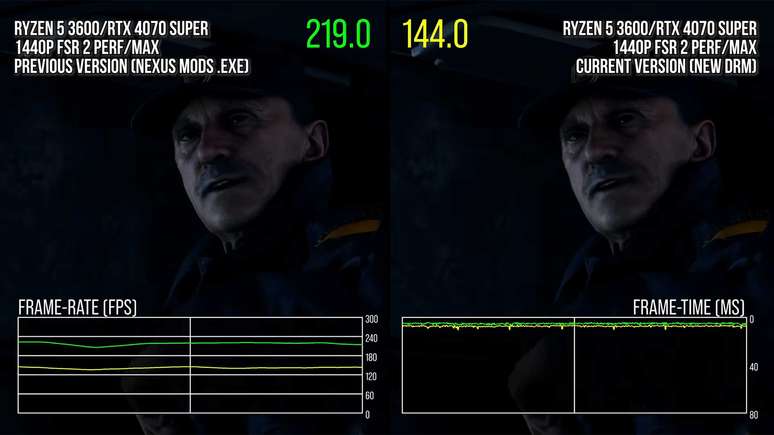 Os testes foram feitos por ele em um PC equipado com processador Ryzen 5 3600 e uma placa de vídeo GeForce RTX 4070 Super, usando a última versão de Resident Evil 4 do Steam e uma atualizada com um mod que restaura o jogo para sua versão anterior, sem o novo DRM.