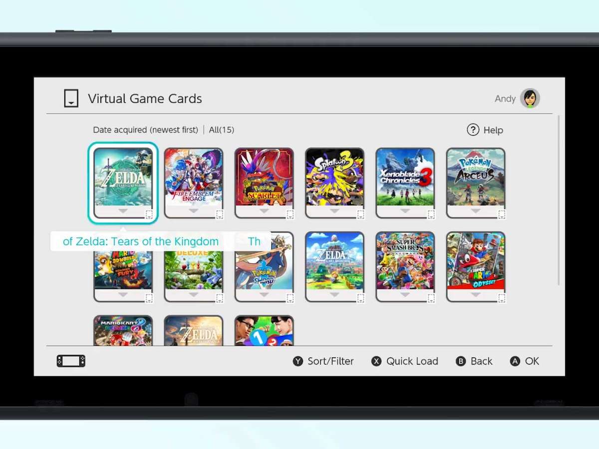 Com a nova atualização, os jogos digitais e DLCs comprados no Switch agora são cartões de jogo virtuais, sendo exibidos em uma lista específica deles. É possível carregar e ejetar virtualmente esses cartões entre até dois Switch.