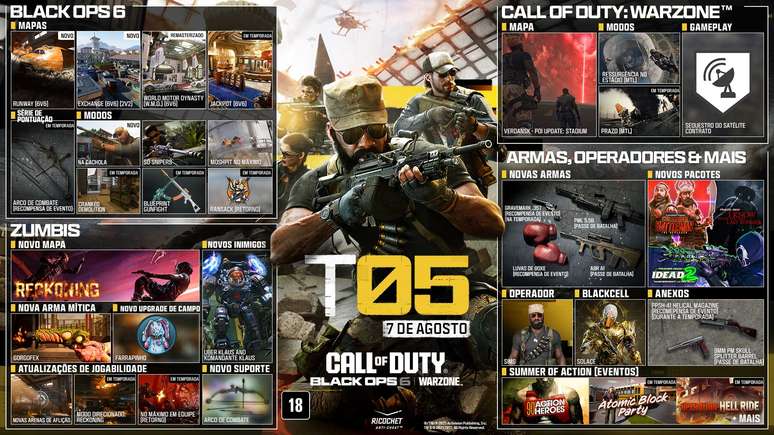 A Temporada 5 chega no dia 7 de agosto em todas as plataformas e traz mapas multiplayer emocionantes, modos de jogo repletos de ação e a conclusão da história de Zumbis para Call of Duty: Black Ops 6.