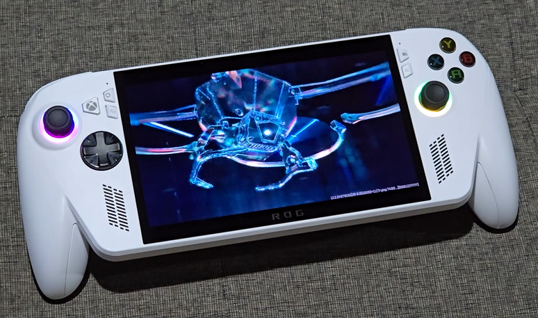 A primeira pegada nele já entrega tudo: robustez, firmeza e charme. O acabamento branco fosco com detalhes geométricos passa um ar futurista sem exagero, daquele jeito que só a ASUS e a Microsoft conseguem quando resolvem trabalhar juntas. É um aparelho que inspira confiança, mas que ao mesmo tempo não pesa, não incomoda, não cansa. É leve, bem distribuído e confortável — perfeito pra jogar no sofá, no busão, no avião, ou naquela madrugada em que você finge que vai dormir mas só mais um capítulo de Starfield não faz mal.