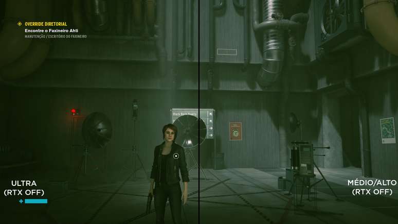 Por fim, retornamos ao Control para testar a tecnologia do Ray Tracing. Na imagem abaixo há, talvez, a grande mudança desse artigo: Qualidade alta vs Qualidade alta com Ray Tracing.