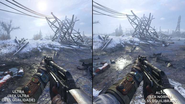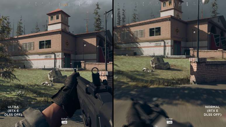 Porém, se olharmos mais atentamente, é possível observar que no lado Ultra as sombras são mais suaves, enquanto no médio há um contorno mais acentuado e distante do real. Além disso, observe a iluminação bem no meio da imagem. No Ultra essa camada de luz é mais “próxima do jogador”, como se estivesse mais densa.