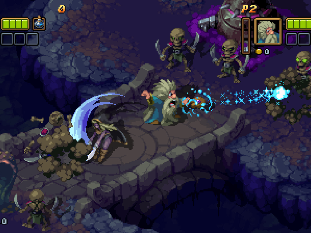 Cada um deles se move e ataca em oito direções e conta com um ataque de perto, um ataque à distância e um movimento ofensivo especial. Fae dá uma disparada girando suas lâminas, enquanto Lolo se teleporta, por exemplo. Os heróis também podem usar itens como bombas e pergaminhos com magias poderosas ao estilo de Golden Axe, detonando todos os inimigos na tela quando lançados.