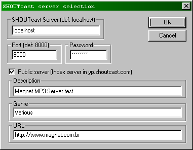 Se você quiser que sua rádio seja divulgada Internet à fora, marque o checkbox Public server, para tornar a sua emissora acessível para qualquer pessoa. Em Description coloque o nome da sua rádio, em Genre escreva o gênero de músicas que você irá transmitir. E no último campo, URL, digite o endereço do site oficial da rádio. Finalize a configuração clicando em OK.