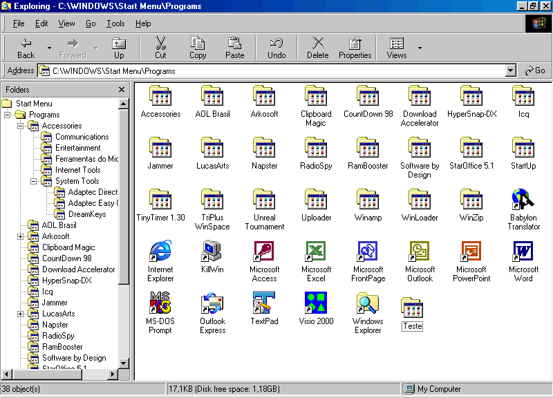 Existem duas maneiras de reorganizar os ícones dentro das pastas. A mais fácil é uma novidade do Windows 98, que permite que você apenas arraste-os para onde você quiser. Para isso clique com o botão esquerdo do mouse sobre um ícone (ou o nome do aplicativo) e, com o botão ainda pressionado, arraste para o lugar que você quiser dentro da árvore de pastas.