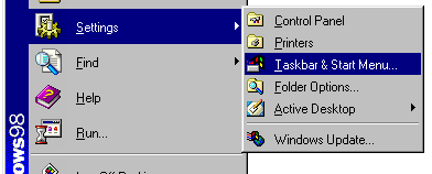 A outra maneira funciona no Windows 95 também. Clique no botão Iniciar (Start), e selecione Configurações (Settings). Agora selecione a opção Barra de Tarefas e Menu Iniciar (Task Bar & Start Menu).