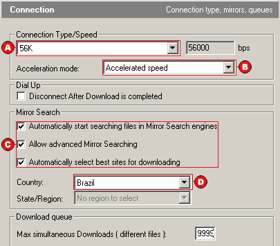 - Selecione os três campos indicados pela letra C. O Download Accelerator passará a buscar os melhores servidores de onde vai baixar o arquivo;