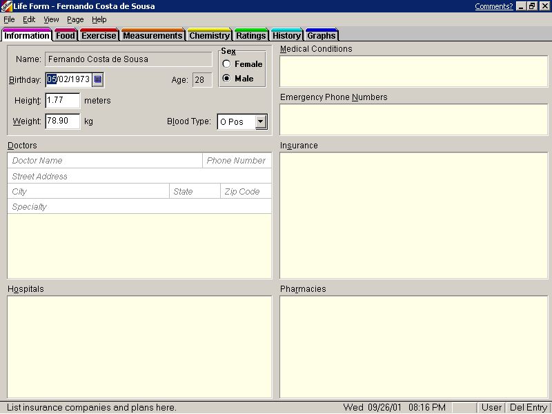 A exemplo do Crosstrainer e do DietPower (fichas acima), o Life Form é um programa que auxilia no acompanhamento de exercícios e da alimentação. Ele tem um visual limpo e simplificado. Uma seção permite ao usuário criar seu próprio banco de dados de médicos, hospitais e até farmácias.