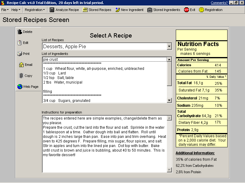 O Recipe Calc é um programa que calcula o valor nutricional de receitas e dietas. Por meio de um completo banco de dados de ingredientes, o usuário monta a sua alimentação. O programa traz algumas receitas e dietas prontas. É possível enviar por e-mail ou salvar no formato HTML.
