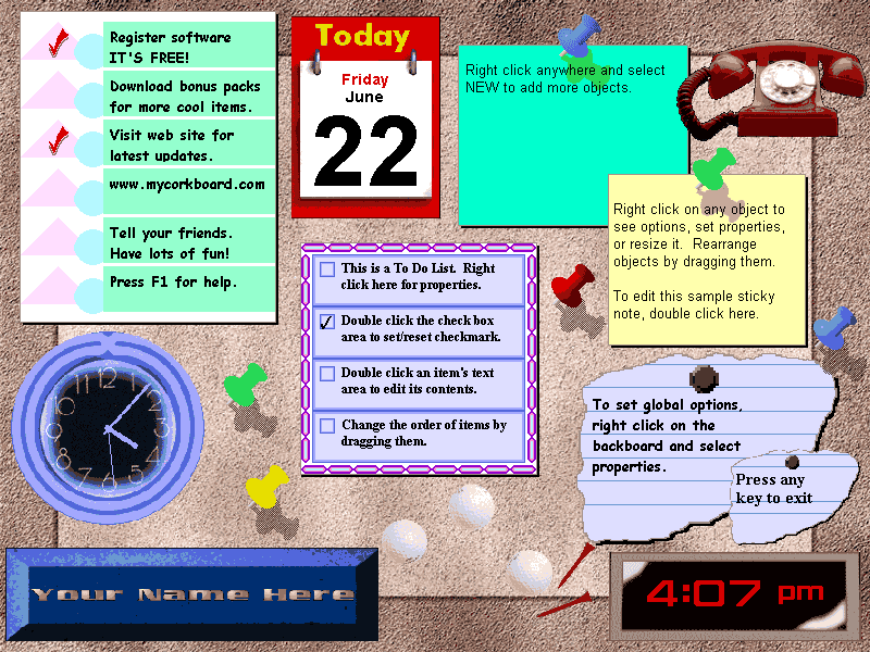 O MyCorkBoard transforma o seu protetor de tela em um quadro de cortiça virtual. Quando o seu computador está ocioso, ele exibe calendário, relógio, anotações, lista de tarefas e até as fotos que você desejar. Além do visual "cortiça", é possível deixar o seu MyCorkBoard com uma série de outros temas. Também dá para baixar plug-ins gratuitos e pagos. O cadastramento - gratuito - dá acesso aos recursos extras.