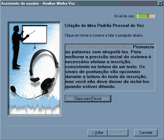 O treinamento deve ser feito por meio de um microfone especial que vem junto com o programa. Ele é um headset e é mais profissional que os dispositivos que costumam vir com os kits multimídia uma vez que filtra ruídos do ambiente. Isso é importante uma vez que o ViaVoice trabalha com um sofisticado sistema de reconhecimento que identifica as palavras de usuários que falem uma mesma língua, mas com sotaques diferentes. Quando o produto é instalado, é preciso ler em tom de voz normal uma série de trechos de romances para que o programa modifique seu banco de dados de palavras para adequá-lo ao jeito de falar do usuário. Por isso pegue um copo d'água, pois você vai ficar recitando Dom Casmurro para seu computador durante pelo menos 15 minutos. O ideal mesmo é que você recite mais de uma história, são várias e cada uma leva cerca de 12 minutos para ser lida. Porém isso ainda não é o bastante, já que a versão em português do ViaVoice só entende palavras do idioma, claro. Se você trabalha em uma área que possua seu próprio jargão, como advocacia, engenharia ou medicina, será necessário ensinar palavra por palavra para o programa. A IBM solucionou o problema com um mecanismo que busca por novos termos em textos arquivados no HD do usuário: basta selecionar os diretórios que o programa exibirá uma lista de todas as palavras que ele não entender. Depois disso, é preciso gravar a pronúncia de cada uma e digitar de maneira literal o jeito que ela é falada. Assim, "Photoshop" fica como "Fotochópi", dependendo do jeito como se pronúncia.