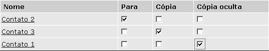 - Observe o exemplo da imagem abaixo. A mensagem seria enviada para "Contato 2", com cópia para "Contato 3" e com cópia oculta para "Contato 1";