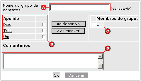 - Na Agenda de endereços, clique no nome do grupo. Você vai para uma página com a caixa abaixo: