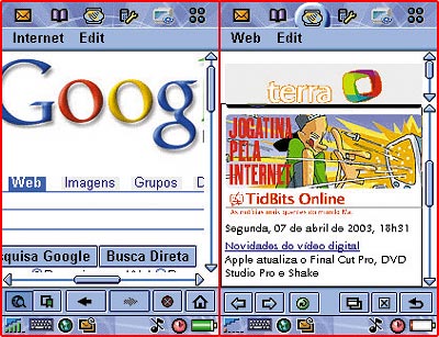 O browser embutido funciona bem, tem um contador que mostra quantos segundos uma página demora para carregar (genial!), mas é incompatível com JavaScript e frames. O ideal é instalar também o Opera, para ampliar as opções de navegação. A velocidade, em média, é semelhante à de um modem de 56k. Dá até para blogar pelo celular. Se existisse um tecladinho Bluetooth para ajudar na digitação de textos longos, eu poderia muito bem parar de levar meu PowerBook em viagens.