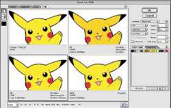 O novo comando Save for Web é um mini-ImageReady dentro do Photoshop 5.5. Você pode fazer nele praticamente tudo que não envolva retoque e composição: mudar o tamanho da imagem, escolher um método de compressão (GIF, JPEG ou PNG), comparar dois ou quatro previews simultâneos com ajustes diferentes e até mesmo editar a palete dos GIFs à mão. E salvar todos os seus ajustes para uso em imagens subseqüentes.