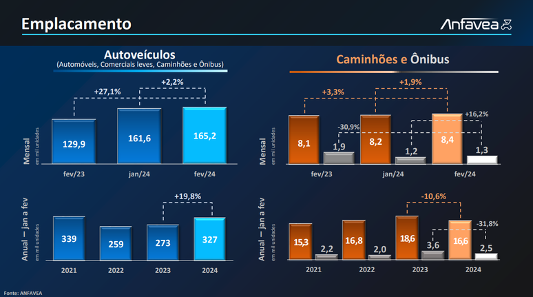 No total de automóveis, comerciais leves, caminhões e ônibus, 165,2 mil unidades foram licenciadas, 2,2% a mais que em janeiro e 27,1% acima de fevereiro do ano passado. O acumulado de vendas é 19,8% superior ao dos primeiros dois meses de 2023.