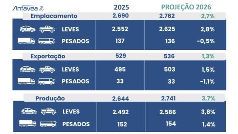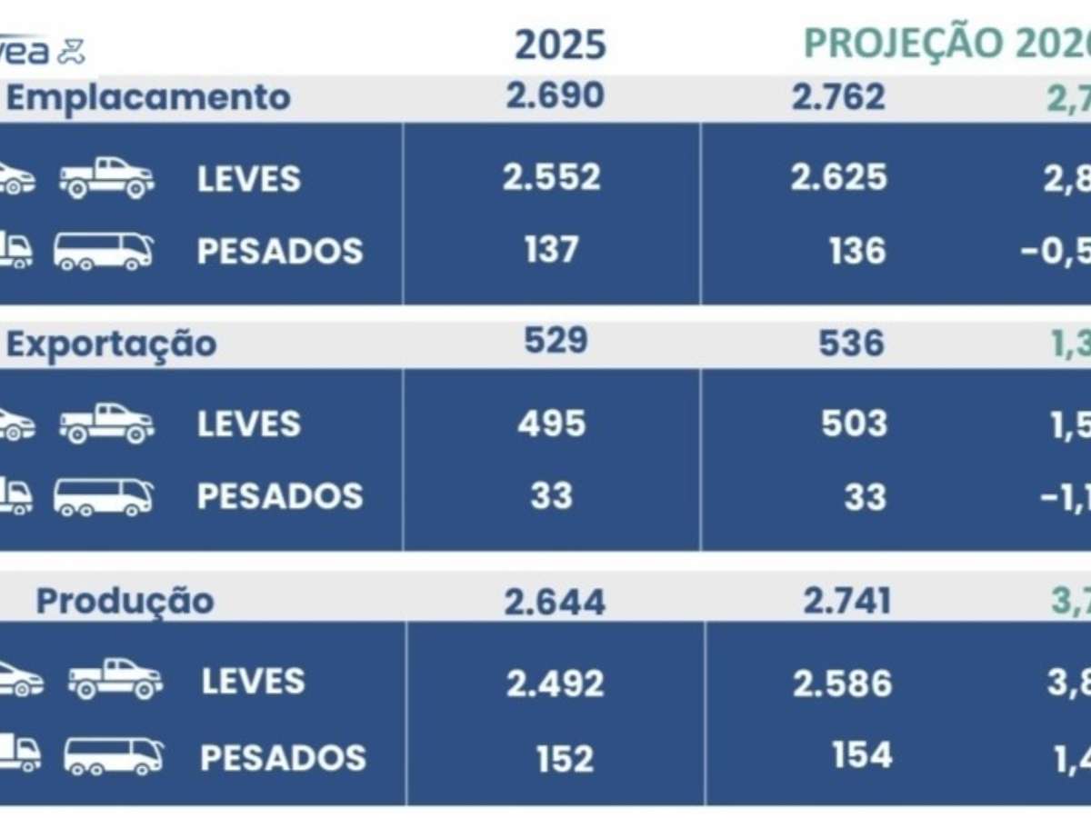 Exportações: Após um salto em 2025, a expectativa é de estabilidade com viés de alta. A projeção é enviar 536 mil unidades ao exterior, um crescimento de 1,3%.