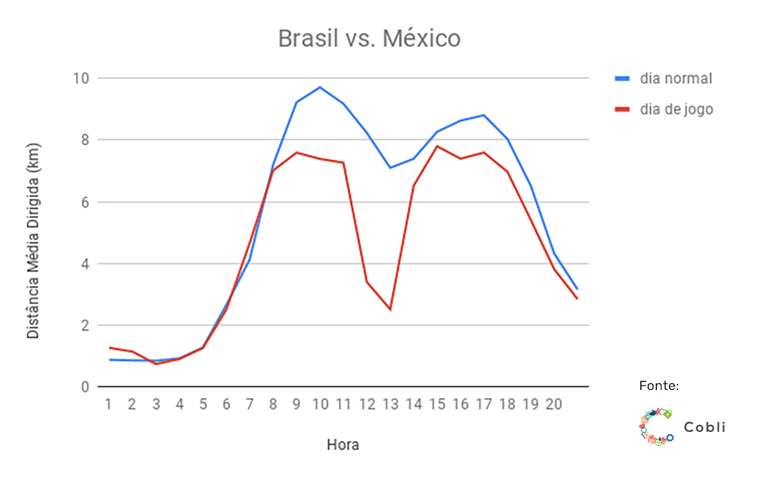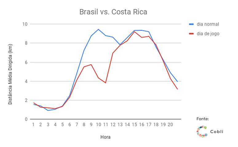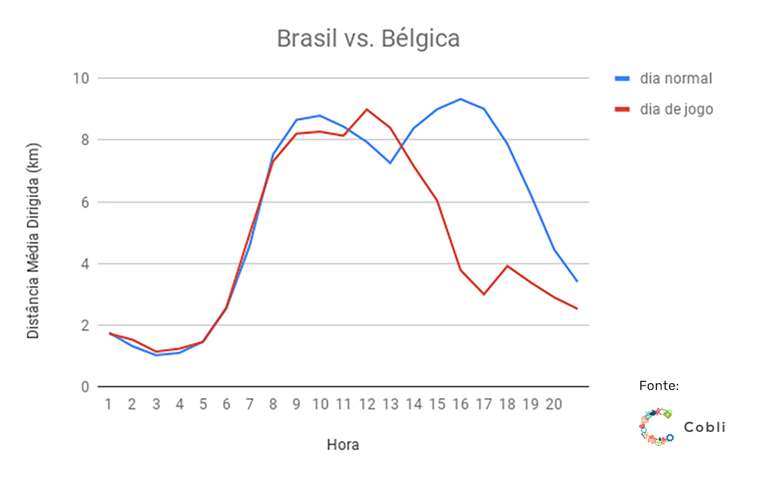 A partir da fase de mata-mata, com o aumento do interesse na Copa, a redução média das atividades cresceu. A quilometragem rodada foi 20% menor ao longo do dia e 38% mais baixa na hora dos jogos do Brasil.