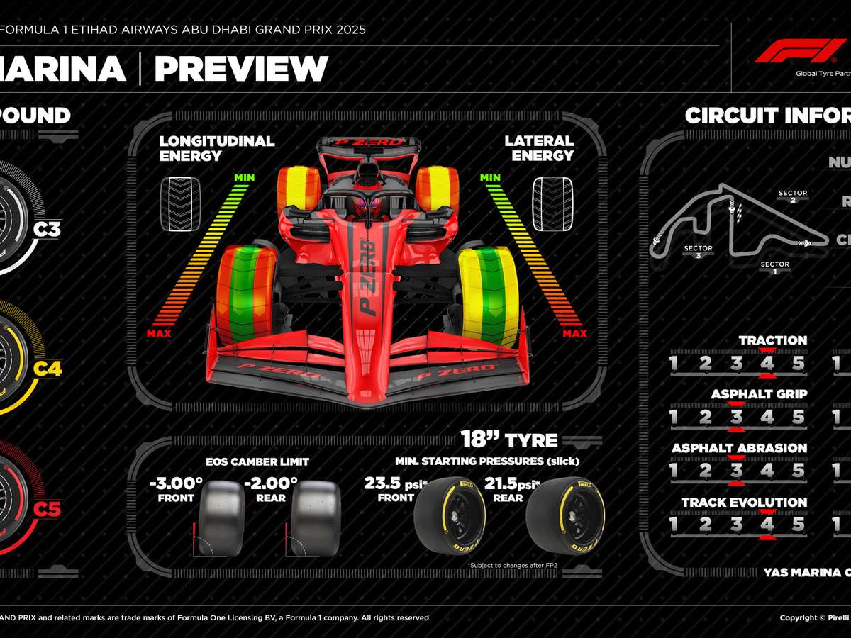 No próximo fim de semana, o circuito de Yas Marina vai receber a vigésima quarta e última etapa da temporada de 2025 da Fórmula 1. O GP de Abu Dhabi será disputado no próximo domingo (7), uma semana depois da última corrida no Catar. Os compostos dos pneus Pirelli para esta corrida são o C3, C4 e C5. Três pilotos ainda disputam o título: Lando Norris (McLaren), Max Verstappen (Red Bull) e Oscar Piastri (McLaren).