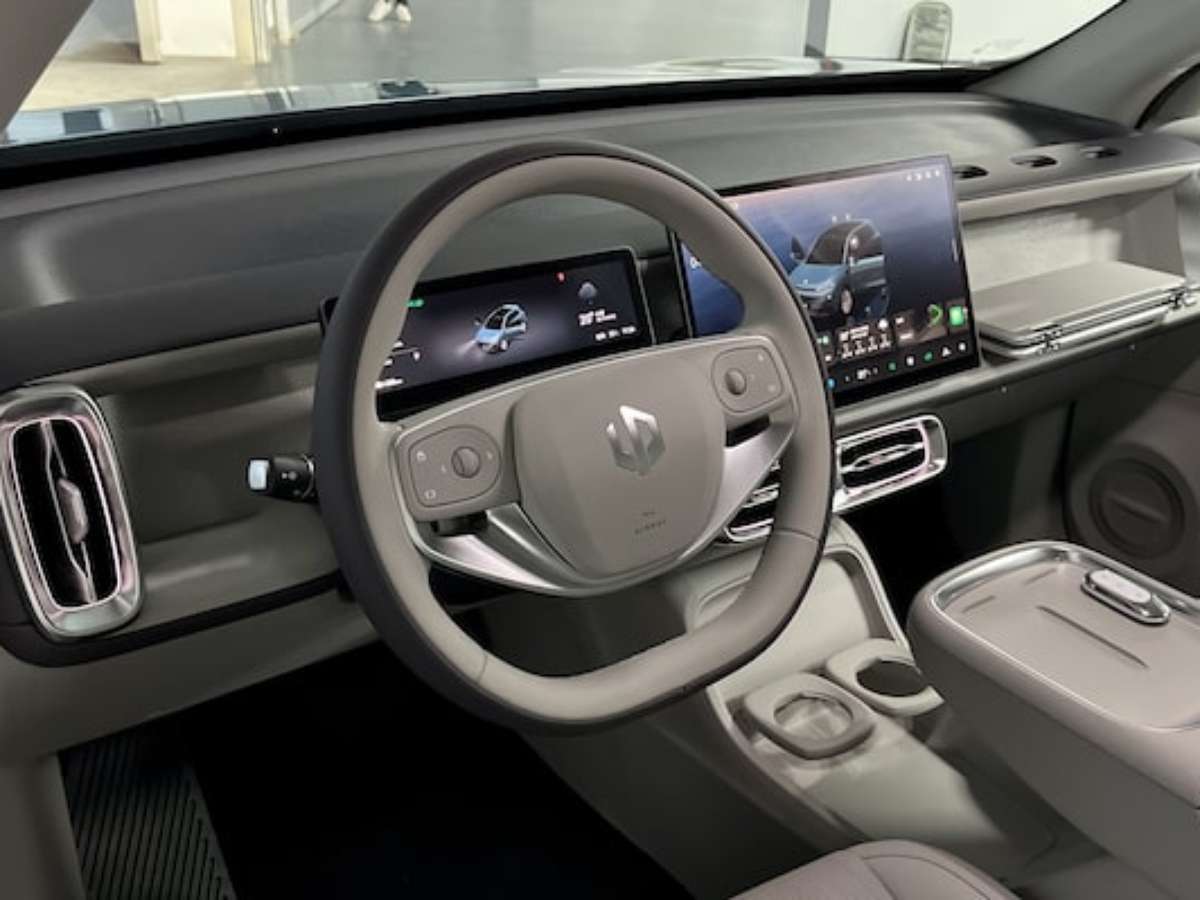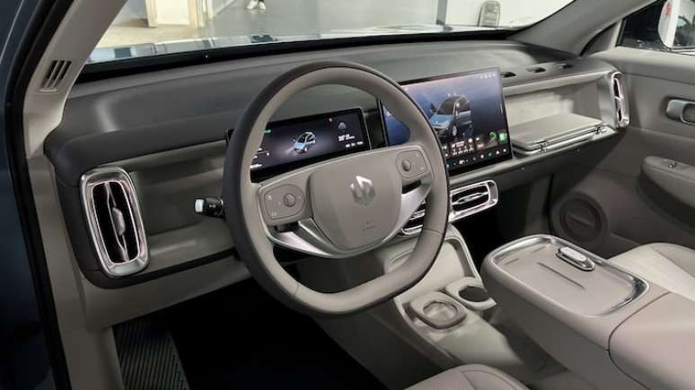 O SUV elétrico não tem botões no painel, apenas no volante. O display do quadro de instrumentos também é moderno e mostra gráficos e dados de bordo, além do avatar do SUV e de outros veículos ao redor.