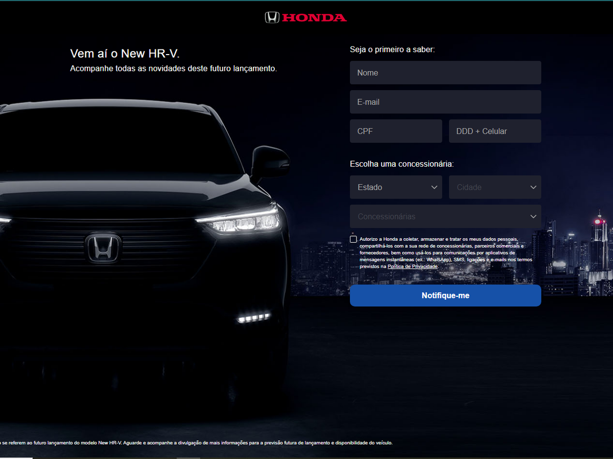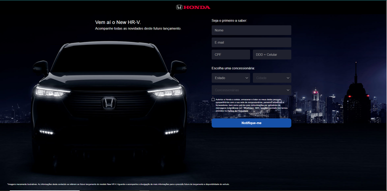 O site mostra apenas uma imagem escurecida do modelo, com destaque para as luzes diurnas em led dos faróis. Além disso, o site conta com espaços para o cliente digitar seus dados pessoais e selecionar a concessionária da Honda mais próxima. Por fim, há também uma mensagem que diz: “Vem aí o New HR-V. Acompanhe todas as novidades deste futuro lançamento”.