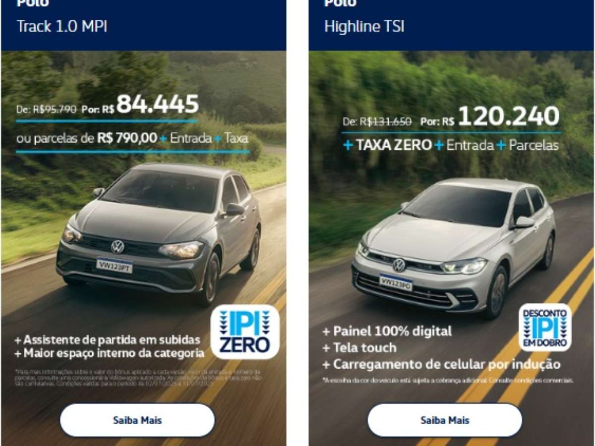 - Polo Highline 170 TSI - de R$ 131.650 por R$ 120.240 (desconto: R$ 11.410)