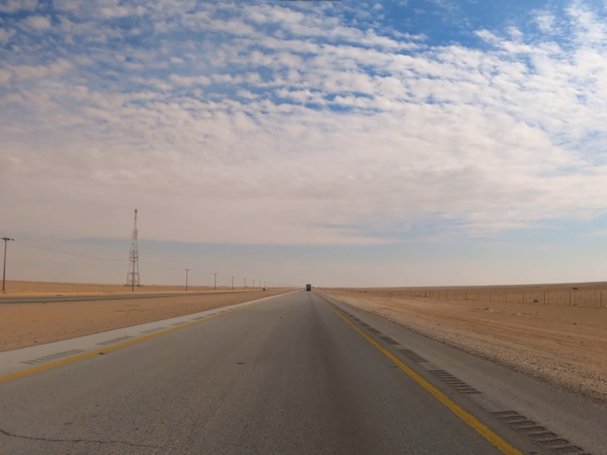 A estrada atravessa o Rub' al Khali, conhecido como o Quarto Vazio, o maior deserto de areia do mundo. A própria área explica por que é possível construir uma rodovia tão retilínea: não há montanhas para contornar, vales para atravessar ou acidentes geográficos para evitar, apenas areia e mais areia até onde a vista alcança. A infraestrutura é totalmente asfaltada e possui principalmente duas faixas em cada sentido, suportando o intenso tráfego de caminhões que atravessam o deserto.