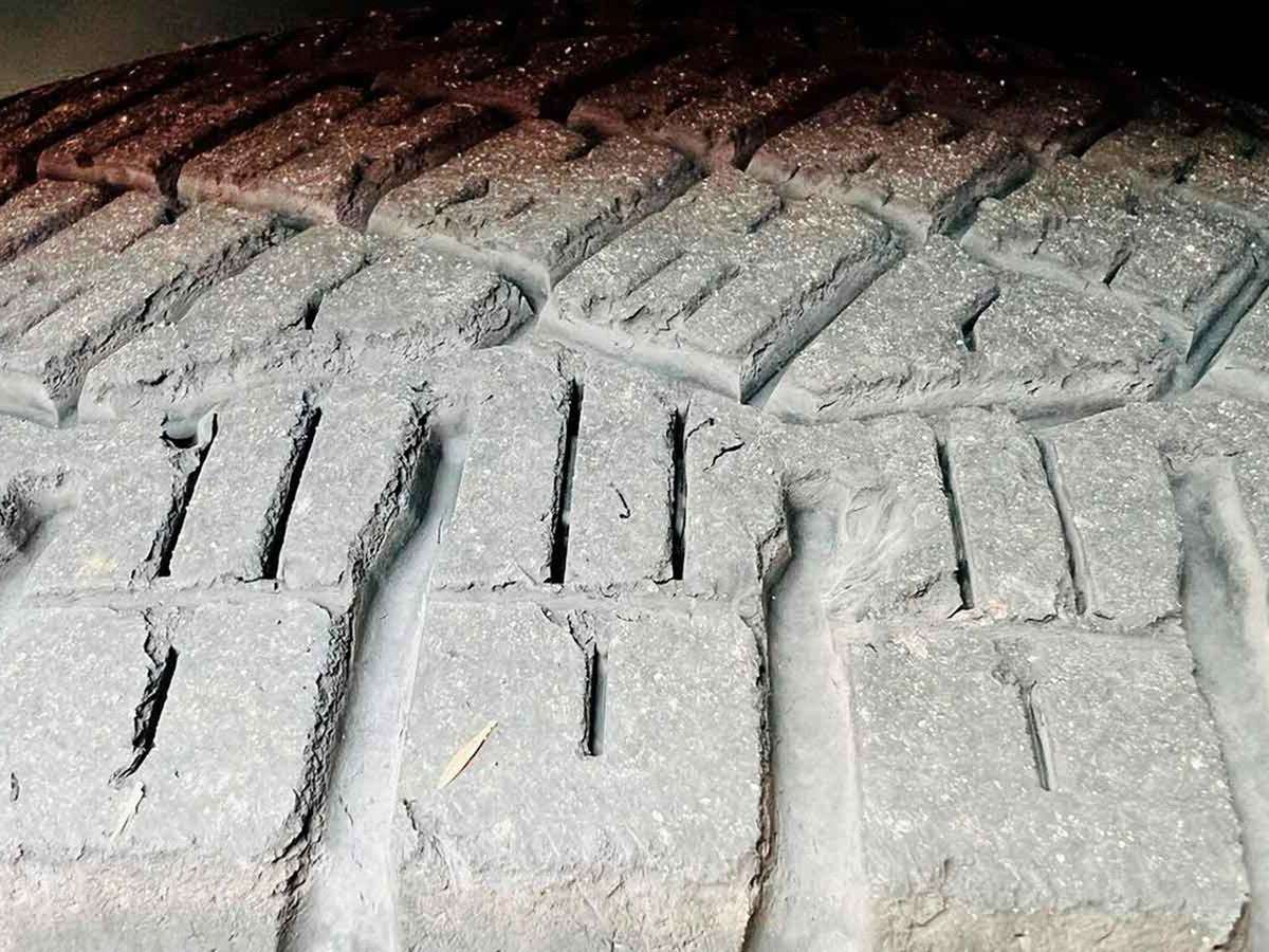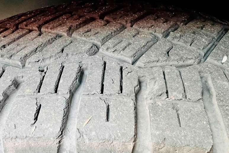 Quando foi trocar as rodas do eixo, como é recomendado no manual ao chegar a essa quilometragem, levou um tremendo susto: os sulcos da banda de rodagem estavam com pouca profundidade. Após medir, como mostra em fotos, os dianteiros tinham 4/32 de polegada de profundidade e os traseiros 5/32, ou seja, 3,2 mm e 3,9 mm respectivamente.