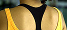 sustentação ao busto, e aparece sob uma camiseta curta, cavada e com decote