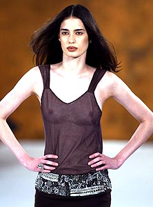» Veja todos os desfiles » Veja todos os desfiles » Confira os bastidores do Fashion RioAndréa Saletto faz um jogo de transparências e sobreposições em sua coleção primavera/verão 2002-2003. A estilista abusou das cores neutras, tecidos leves (chiffon e renda) e corte reto. Nada de assimetrias ou detalhes carregados: os destaques aparecem em aplicações de metais em T-shirts. Regatas aparecem sobrepostas, insinuando uma leve transparência. Foram 23 modelos apresentados nas cores branco, marrom e pérola. As jóias em ouro branco de Miriam Kimelblat se destacaram na elegante coleção de Saletto.