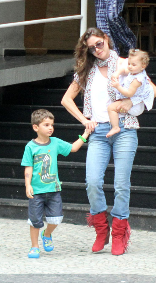 A atriz fez um passeio com os filhos, usando calça jeans, camisetinha branca e um lenço florido ao redor do pescoço. Nos pés, apostou em bota de cano baixo com franja.