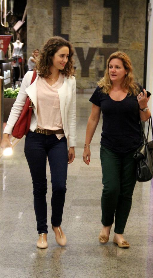 A atriz foi clicada circulando por um shopping na Barra da Tijuca, Rio de Janeiro, com calça jeans skinny, cinto grosso marcando a cintura, camisetinha de malha e casaco branco.
