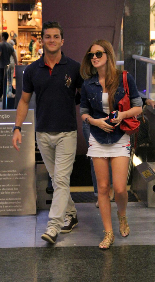 Para um passeio ao lado do namorado, a atriz optou por saia curtinha branca, com estampa nas laterais, coordenada com camisa jeans escura e rasteirinha fechada nude.
