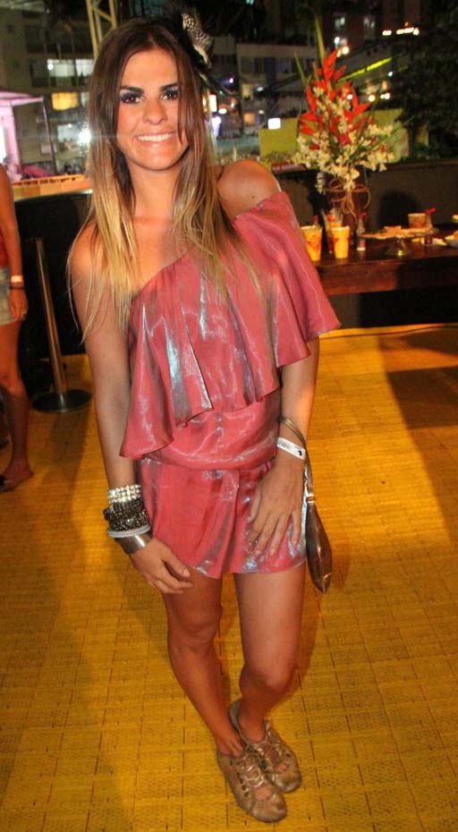 A atriz Julianne Trevisol participou de um baile no Rio de Janeiro com look despojado: shorts jeans curto, regata de paetê e sandália amarrada às pernas.