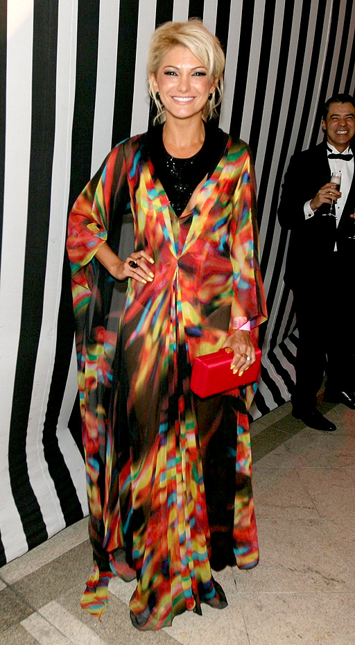 A eterna musa do Carnaval, Luiza Brunet, compareceu ao baile do Copacabana Palace usando um longo plissado cinza, com detalhes prateados na região do busto. Luiza quebrou a sobriedade do tom claro com uma clutch dourada.