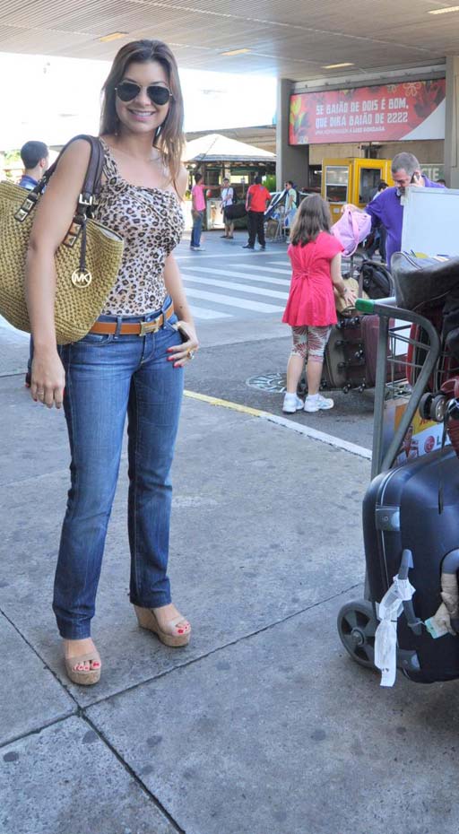 Amanda Francoso foi fotografada no aeroporto de Salvador ao lado de muitas malas. Ela usava calça jeans ajustada ao corpo, blusa com estampa animal print e acessórios na cor bege.