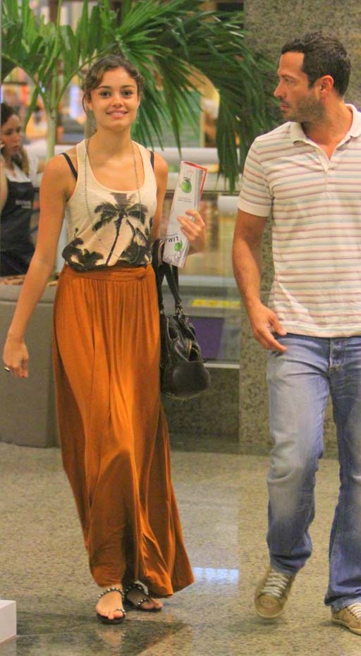 Sophie Charlotte passeou por um shopping no Rio de Janeiro, acompanhada do namorado Malvino Salvador, usando saia longa ocre, combinada à regata com estampa tropical.