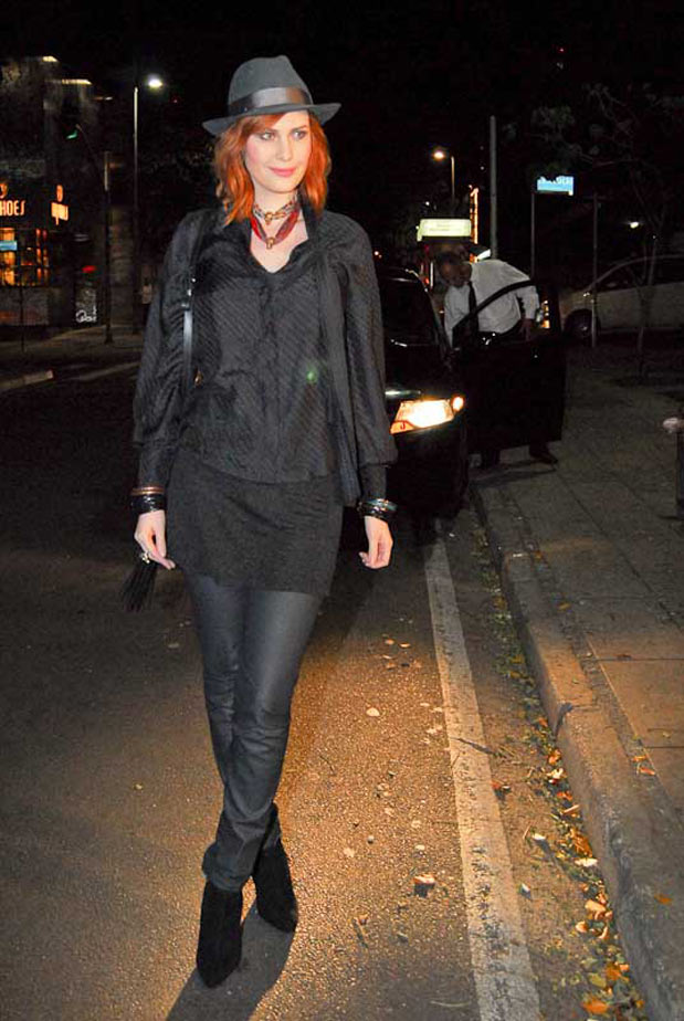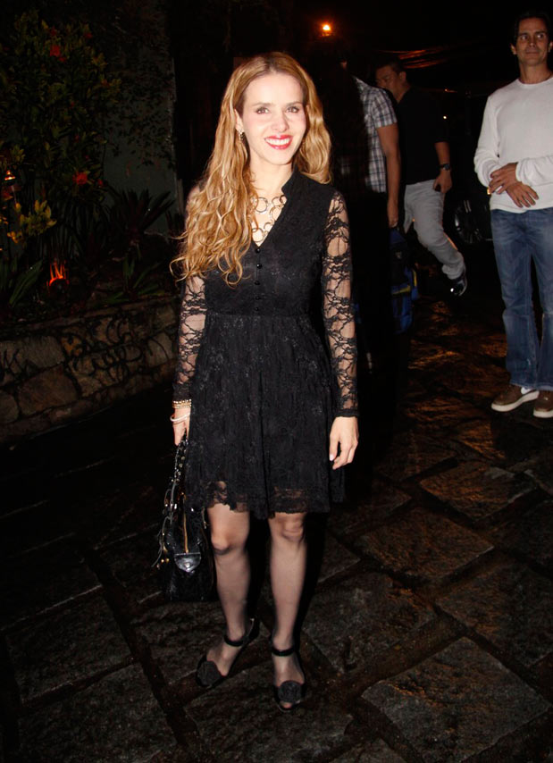 A atriz esteve na casa do diretor Wolf Maia na noite de segunda-feira (22), em festa que celebrou o início da novela Fina Estampa, no Rio de Janeiro (RJ). Leona usou um vestido preto de renda, com mangas longas, combinado com meia-calça preta fina, colar de argolas e sapatilhas que achataram sua silhueta.