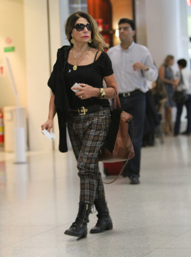 A cantora foi vista circulando pelo aeroporto Santos Dumont, no Rio de Janeiro (RJ), na tarde de quinta-feira (18). Elba usava coturnos pretos, calça xadrez por dentro do calçado, cinto com fivela dourada, blusa preta deixando o ombro (e a alça do sutiã) à mostra e brincos, medalhão e relógio dourados.