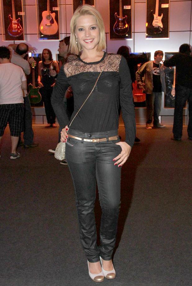 A atriz prestigiou a inauguração do ateliê de uma estilista de noivas no Rio de Janeiro (RJ), na noite de terça-feira (27), usando bota tipo cowboy sobre calça jeans, camiseta branca com detalhe rosa e colete com babados em renda também cor-de-rosa.