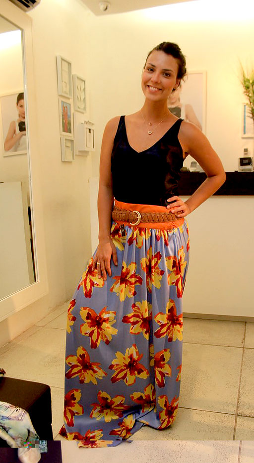A atriz Camila Rodrigues visitou uma loja em Ipanema usando um vestido preto, mas aproveitou para experimentar alguns modelitos: um vestido estampado e uma saia longa com cinto e regata.