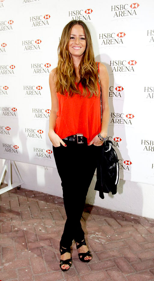 A atriz Erika Mader visitou o HSBC Arena usando calça preta, regata soltinha vermelha e sandálias altas.