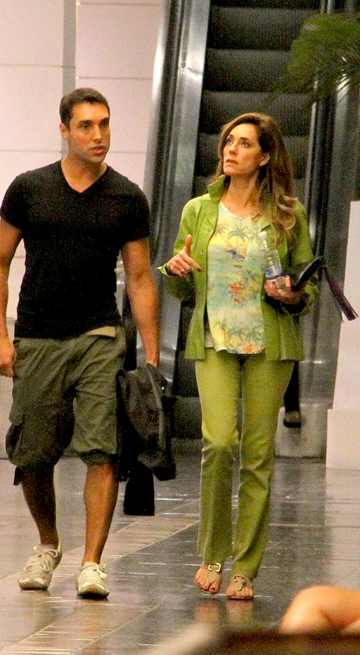 Christiane Torloni passeou pelo shopping Fashion Mall usando um conjunto verde e blusa soltinha com estampa tropical; nos pés, rasteirinha nude.