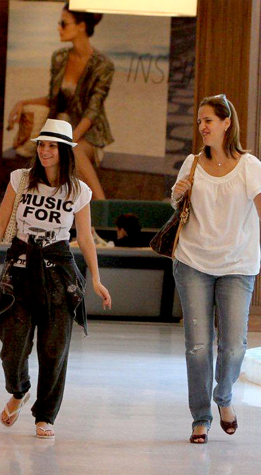 Luma de Oliveira e sua irmã Isis de Oliveira visitaram uma loja no Shopping Fashion Mall. Isis foi com uma roupa de academia em tons de rosa, laranja e verde soldado; enquanto Luma usou calça branca básica e regata.