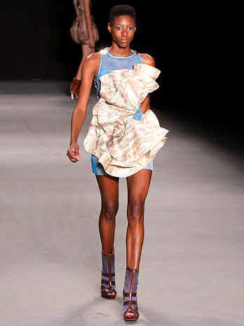 A aplicação de babado enorme, formando um volume tridimensional na frente do vestido de Melk Z-Da não é boa opção: engrandece demais a silhueta