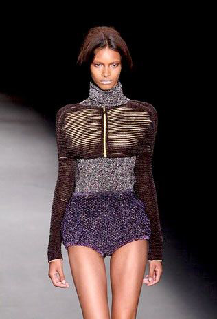 O estilista Lucas Nascimento, especializado em tricô, fez peças brilhantes para o inverno. Claro que a hot pant (calcinha grande) é difícil de usar, mas o tecido não.