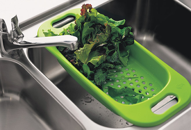 O escorredor serve para talheres, copos e higienização de verduras, legumes e frutas. Suas alças laterais promovem encaixe na cuba da pia. Preço: R$23,80 Design: Cristina Zatti/Coza /Caxias do Sul – RS.